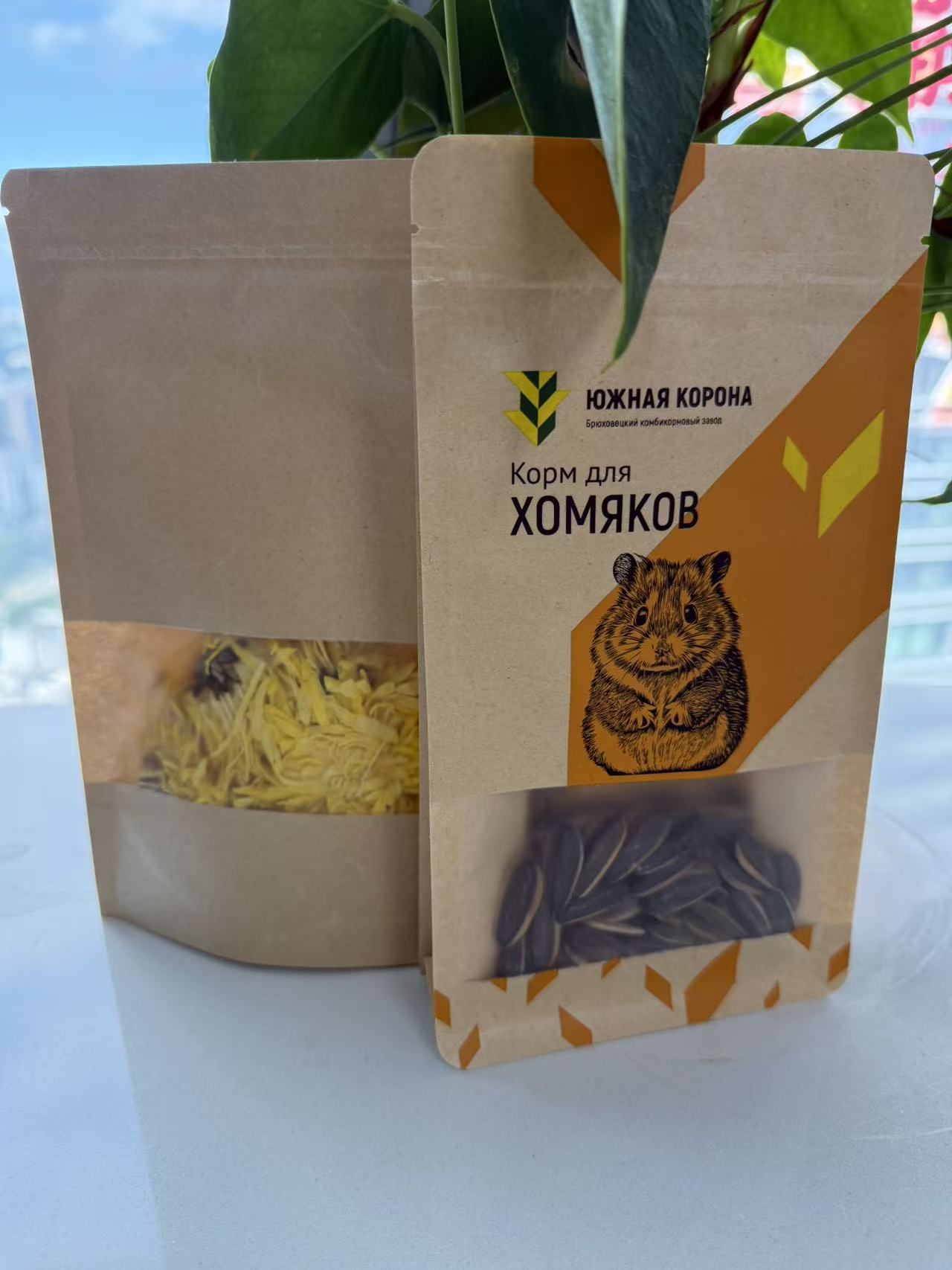 This custom kraft stand-up pouch is designed for pet snacks. It features a front window that allows customers to see the product clearly, enhancing trust and appeal.