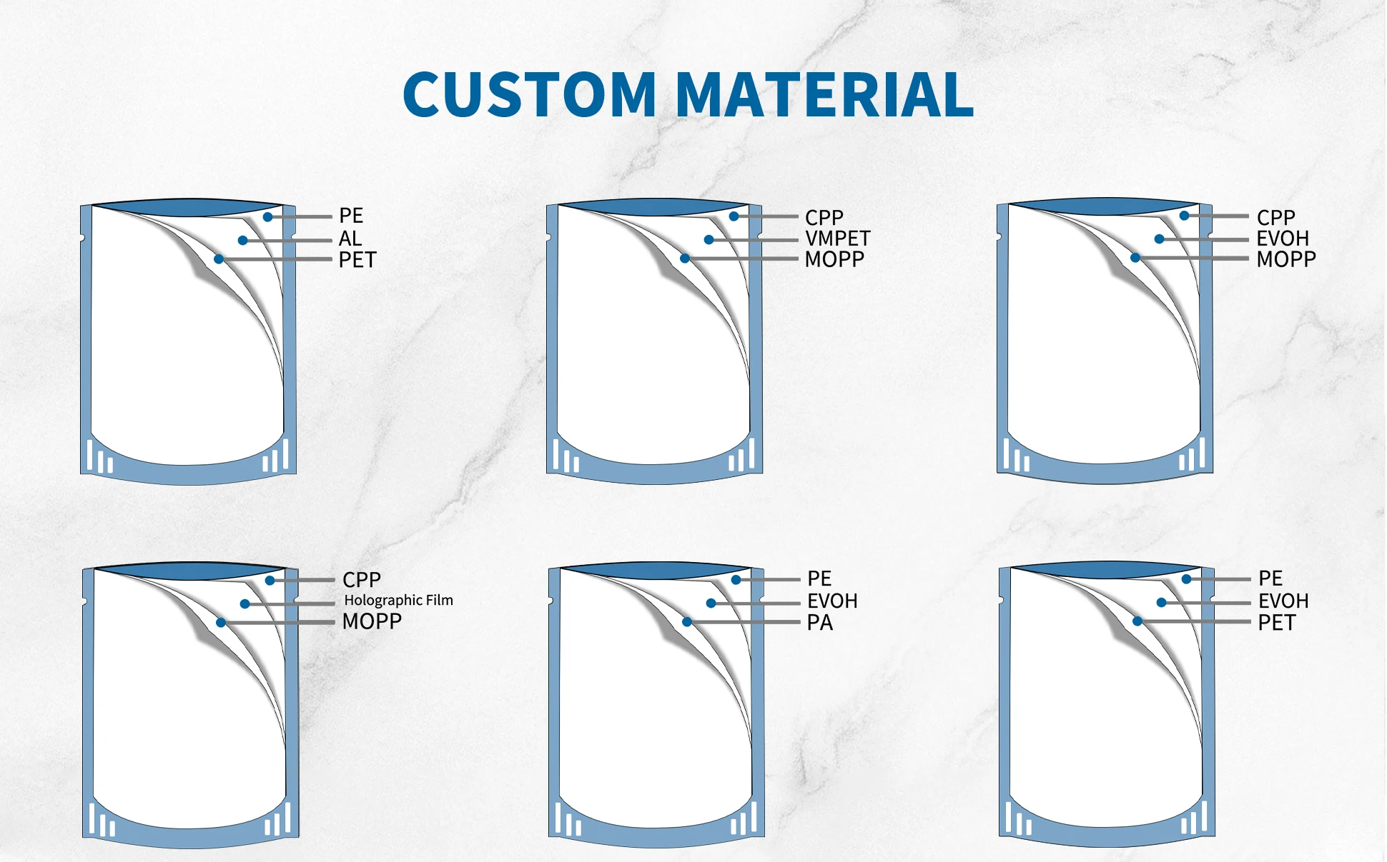 We provide 5 ready stock sizes to meet different capacity needs: 10×18cm (small capacity, suitable for small snacks, seeds), 13×20cm (medium capacity, suitable for cookies, bath salts), 15×23cm (universal capacity, suitable for coffee beans, dried fruits), 18×28cm (large capacity, suitable for bulk snacks, dehydrated food), 20×30cm (extra-large capacity, suitable for commercial packaging). In addition, we support bulk custom printing (brand logo, product information) and custom sizes to meet your personalized brand packaging needs.