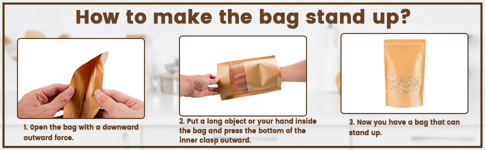 Structure: Widened thickened stand‑up bottom, stable standing; built‑in resealable zipper; easy tear notch; hanging hole for display
